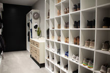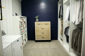 For these his and hers closets, we transformed a former in-home gym into a secondary closet and laundry room. In each closet, we created custom shoe boxes to accommodate varying shoes sizes. Shiplap walls were used to add personality to the closets. Clothing dividers and rods were added to help keep the clients organized and to adapt to different clothing lengths. For the his closet, we built a custom suit cabinet to keep suits from getting dusty, as well as large drawers to keep accessories and dress shoes, and added a bench for a touch of luxury and ease.